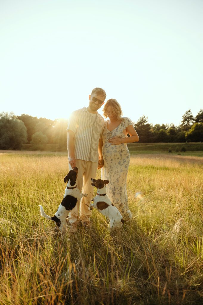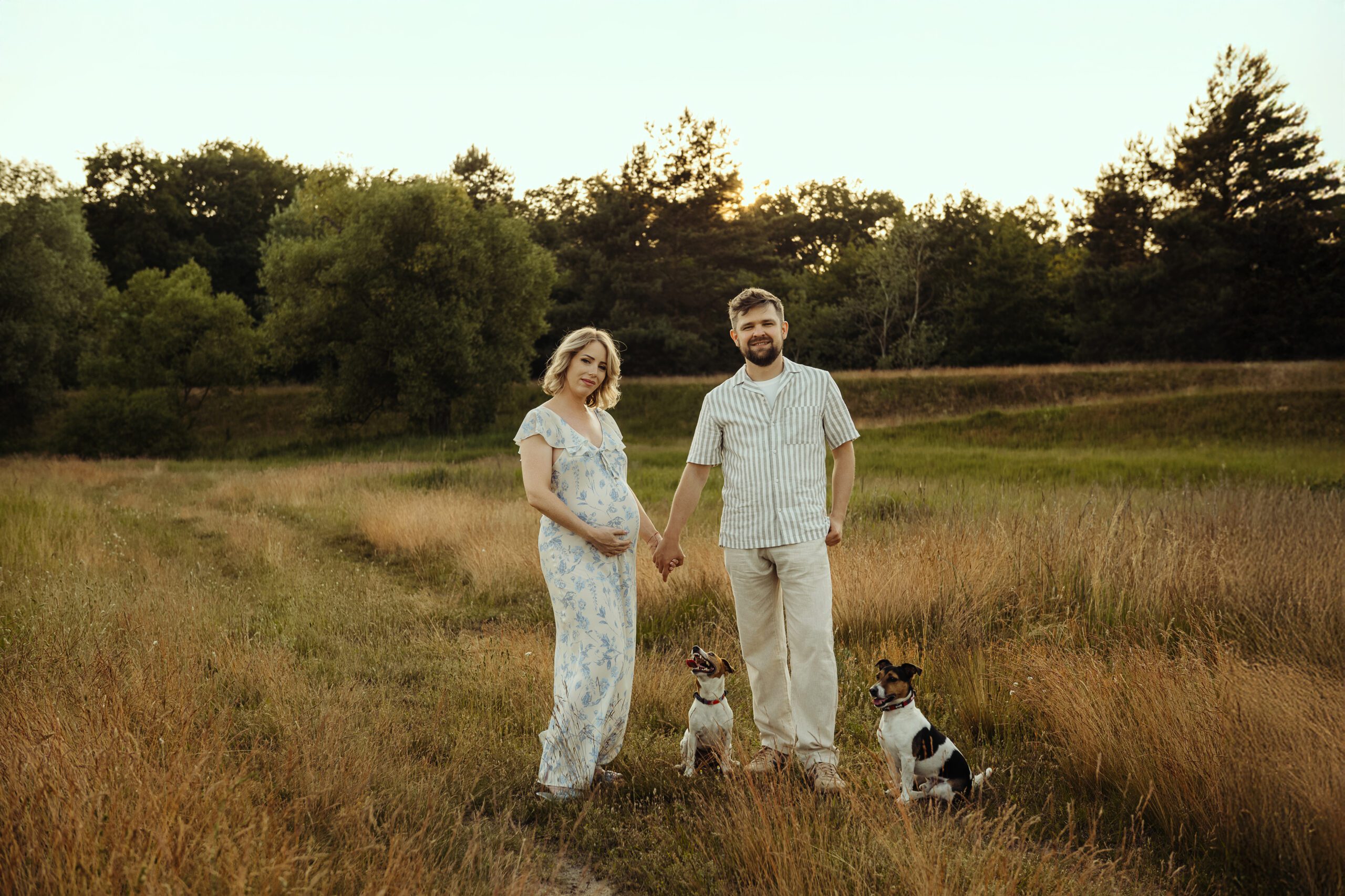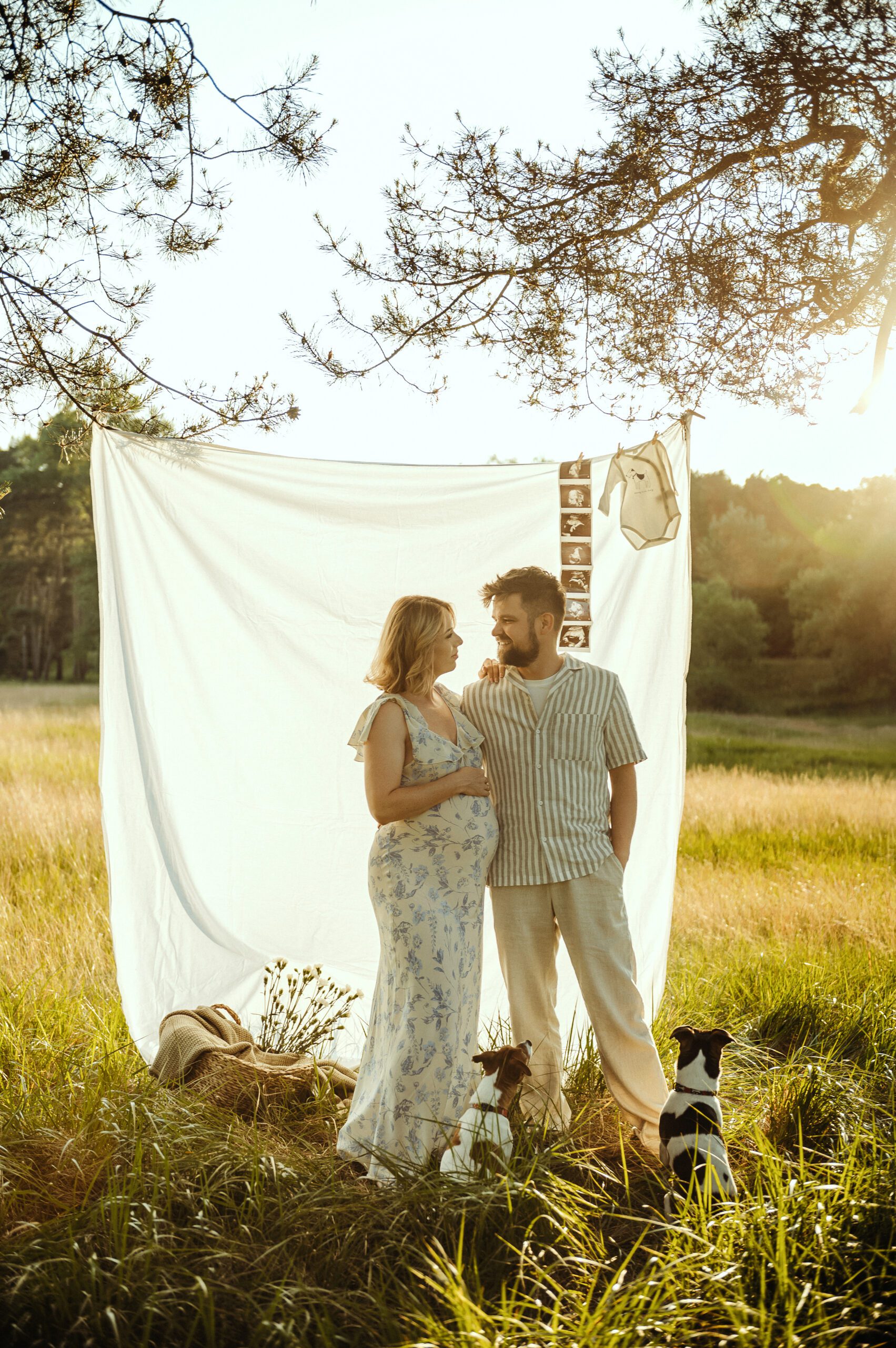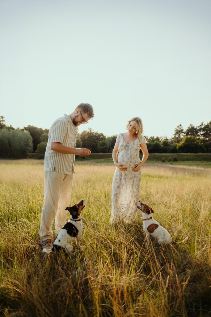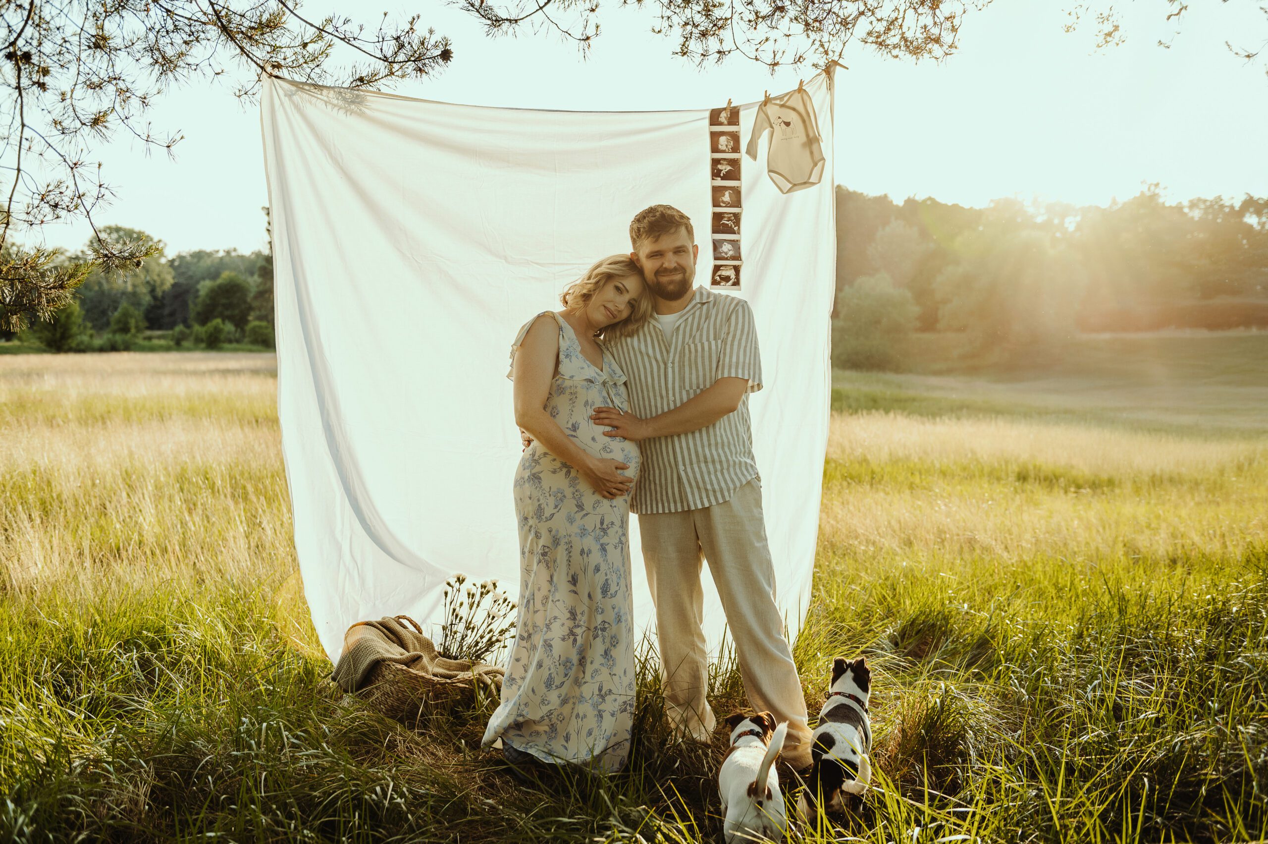 Czas oczekiwania to jeden z najpiękniejszych momentów w życiu. Mam ogromną przyjemność podzielić się z Wami efektami magicznej sesji ciążowej Dominiki i Rafała, która odbyła się w sercu natury, w malowniczych okolicach Zaniemyśla nad Wartą. Spotkaliśmy się tuż przed zachodem słońca, aby w pełni wykorzystać ciepłe, miękkie światło złotej godziny. To właśnie ono nadało kadrom niezwykłej, intymnej atmosfery. Dominika, w zwiewnej sukience podkreślającej jej piękny brzuszek, wyglądała zjawiskowo. Wraz z Rafałem stworzyli obraz pełen miłości, czułości i radosnego wyczekiwania na nowego członka rodziny. Ta sesja była wyjątkowa również dlatego, że towarzyszyły nam ich dwa urocze psy, które są niezwykle ważną częścią rodziny. Uchwycenie ich wspólnej relacji, pełnej swobody i radości, było czystą przyjemnością. To dowód na to, że sesja ciążowa z psami to wspaniały pomysł na stworzenie autentycznej i niezapomnianej pamiątki.