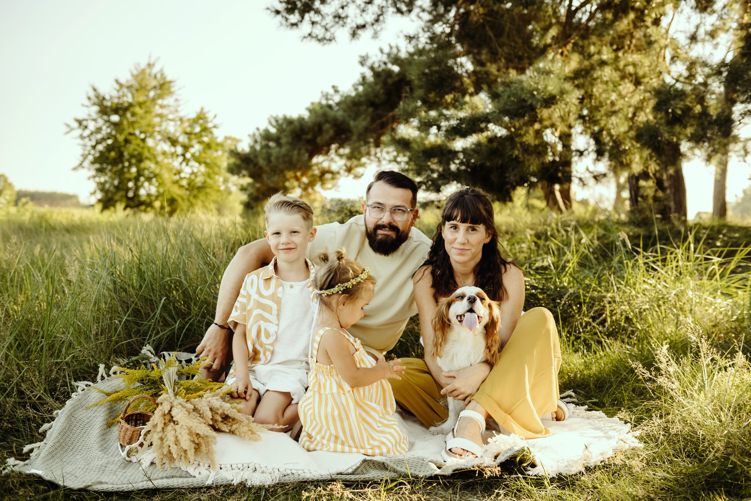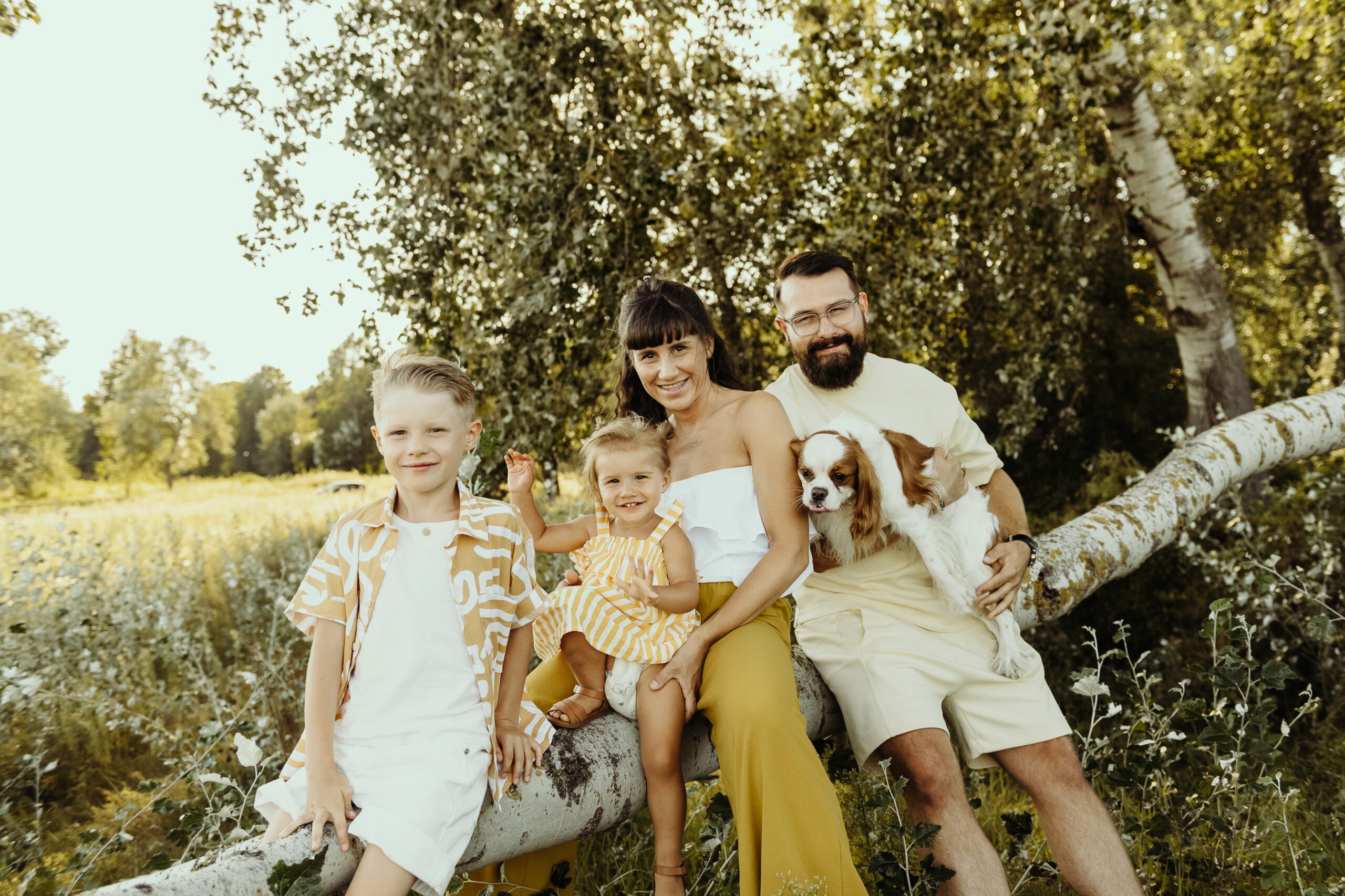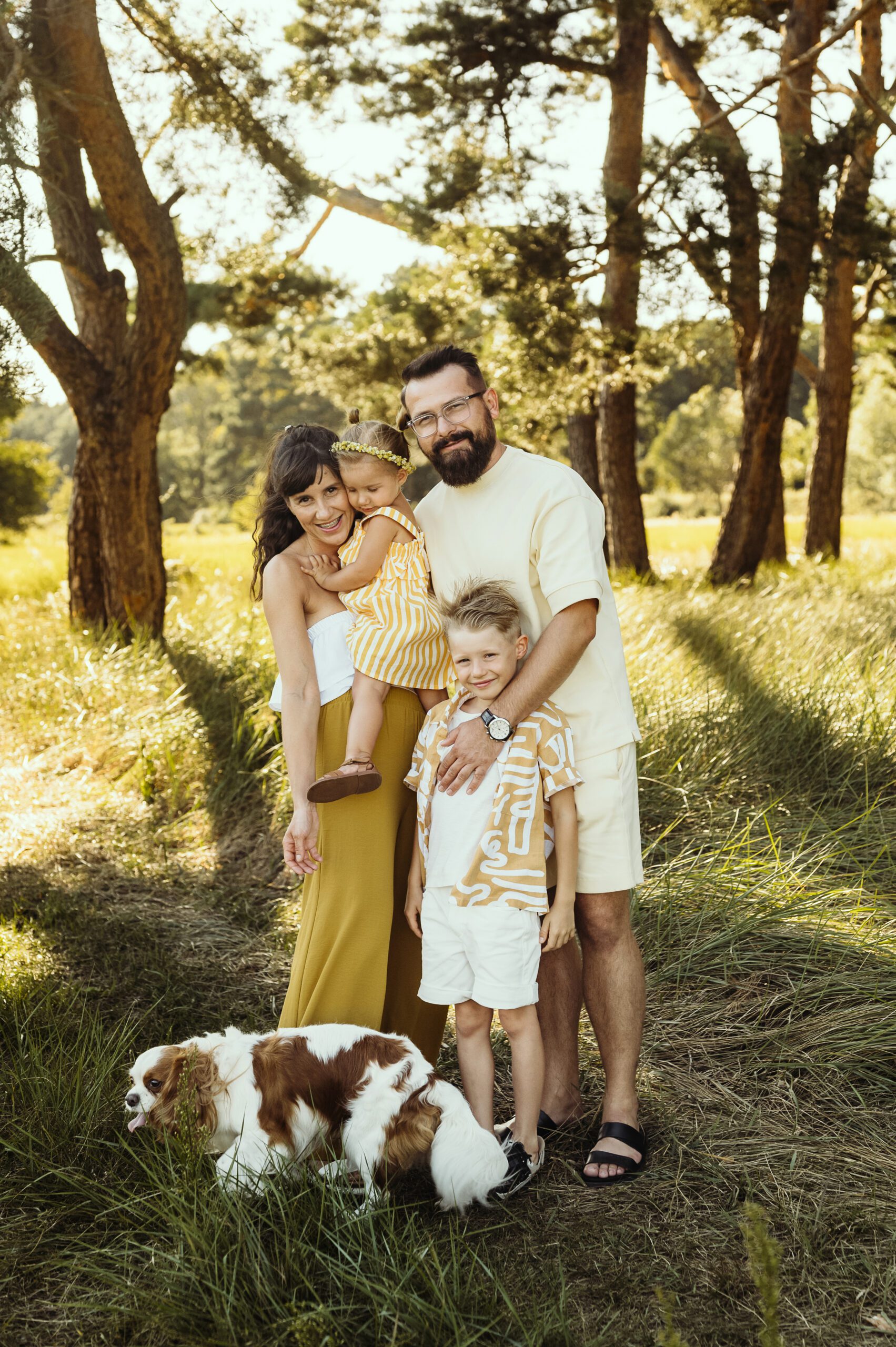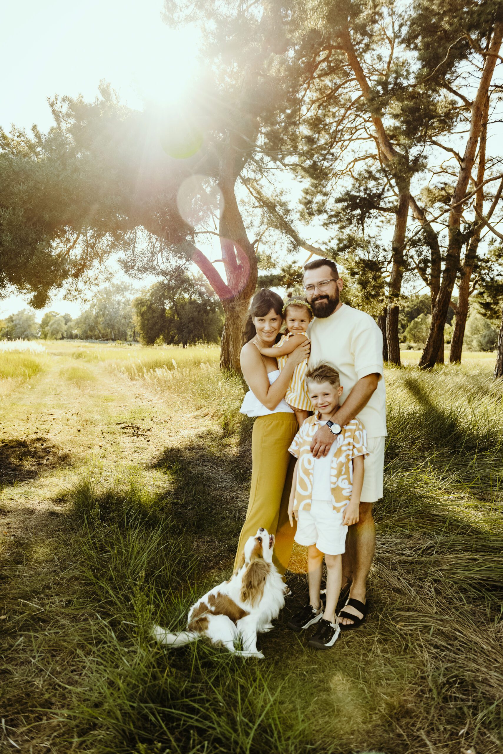 W sesji wziął udział również czworonożny członek rodziny, co wniosło jeszcze więcej radości i dynamiki. Sesja rodzinna z psem to zawsze świetny pomysł na uchwycenie pełnego obrazu Waszej codzienności i miłości.