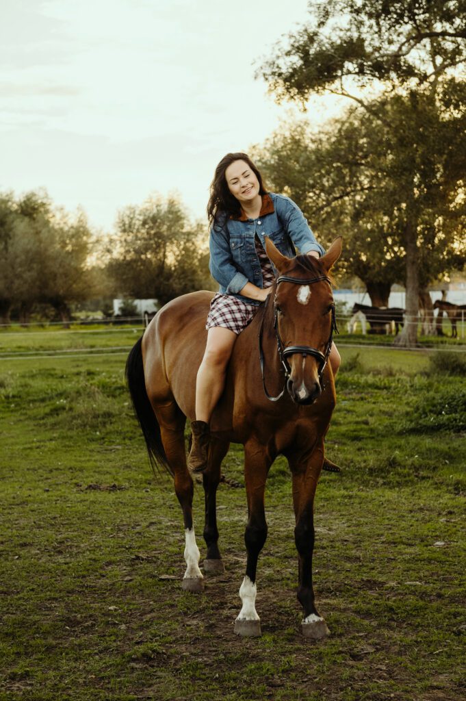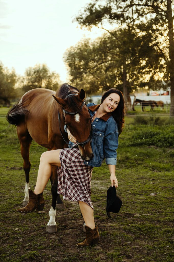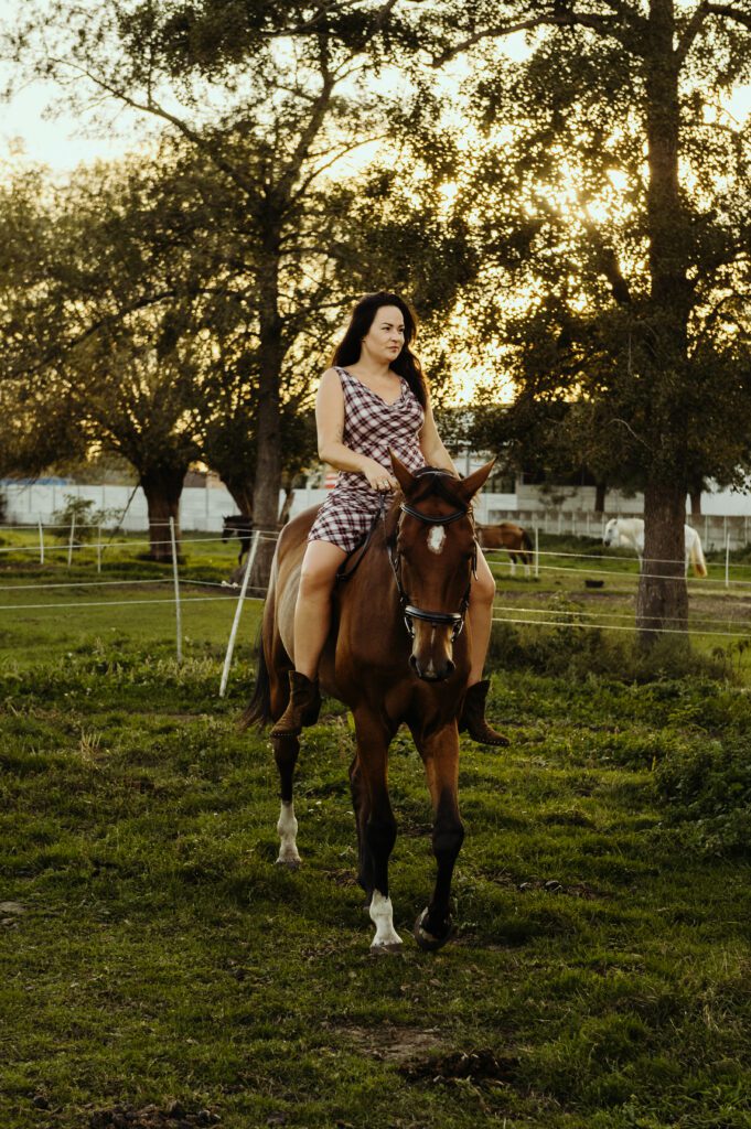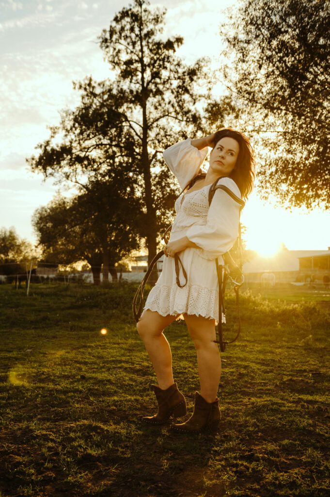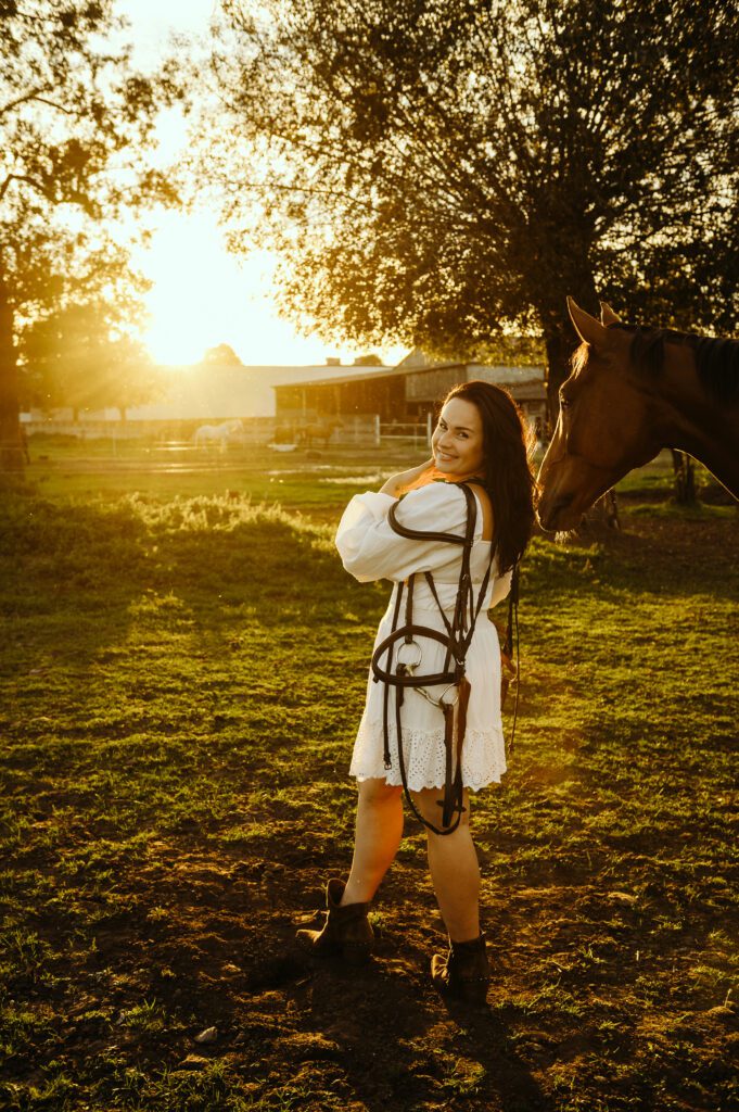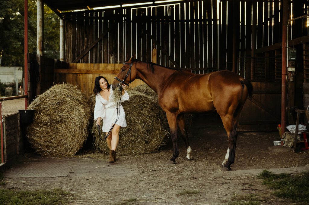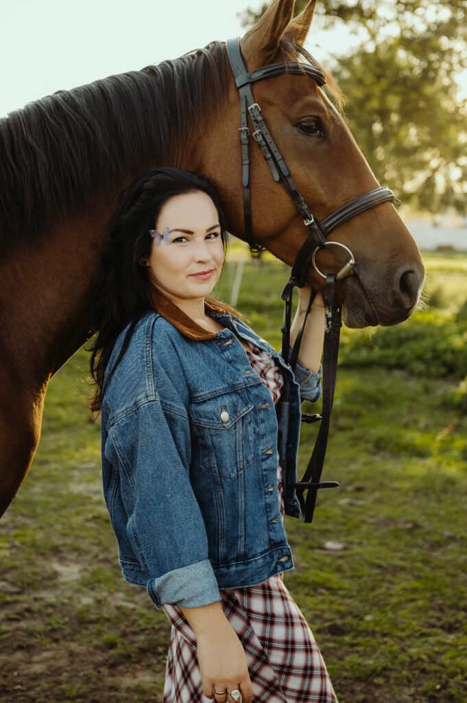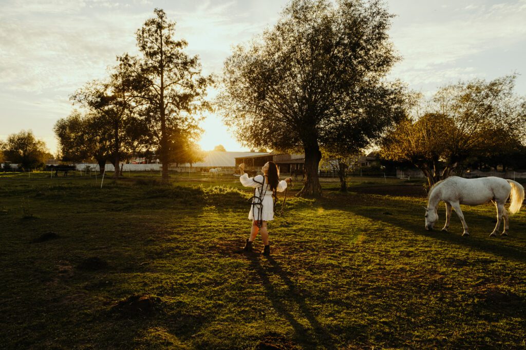 Jest taki moment na przełomie lata i jesieni, kiedy światło słońca staje się niezwykle miękkie i maluje wszystko nasyconymi odcieniami złota. To idealna pora na uchwycenie prawdziwej magii w kadrach. Właśnie w takiej scenerii odbyła się wyjątkowa, indywidualna sesja zdjęciowa Darii z jej dwoma wspaniałymi przyjaciółmi – jej końmi.